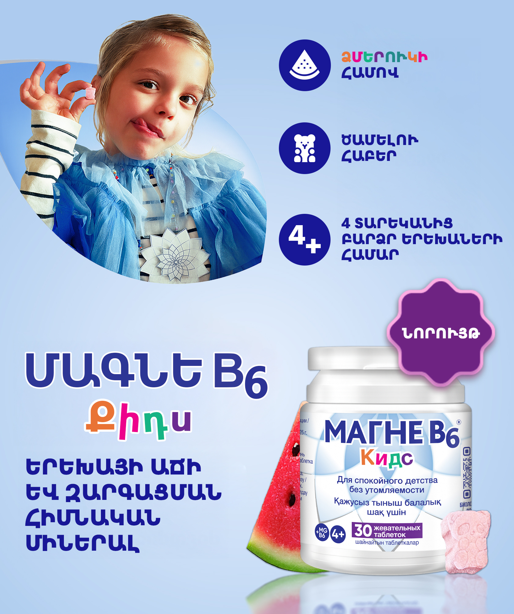Մագնե B6 Քիդս-ը կենսաբանական ակտիվ հավելում է՝ հաստատված մագնեզիումի և B6 վիտամինի համադրությամբ։ Այն պարունակում է օրգանական մագնեզիումի ցիտրատ, որը արդյունավետ կերպով լրացնում է մագնեզիումի պահանջը, իսկ B6 վիտամինը նպաստում է դրա ավելի լավ յուրացմանը օրգանիզմում։ Մագնե B6 Քիդս-ը օգնում է պահպանել․